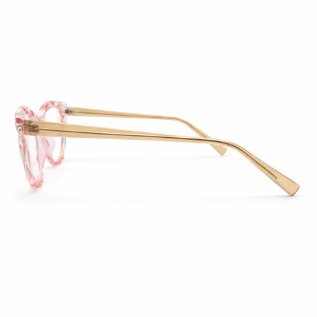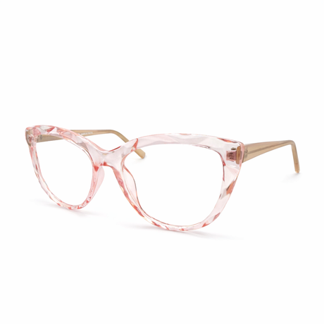 Soft, feminine cat-eye frame in a transparent pink crystal finish. Lightweight and prescription-ready for everyday wear.