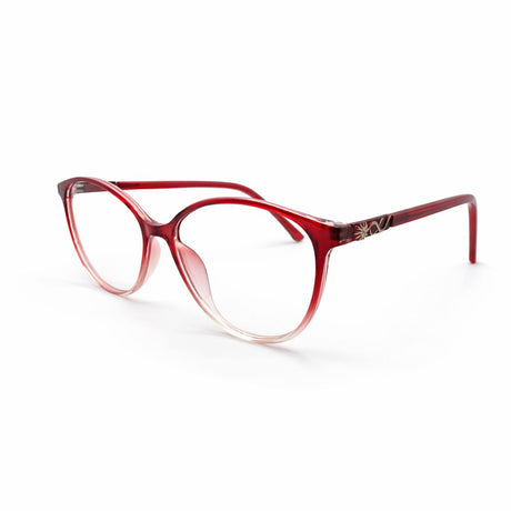 Soft, feminine rounded cat-eye frame in a transparent red crystal finish. Lightweight and prescription-ready for everyday wear.